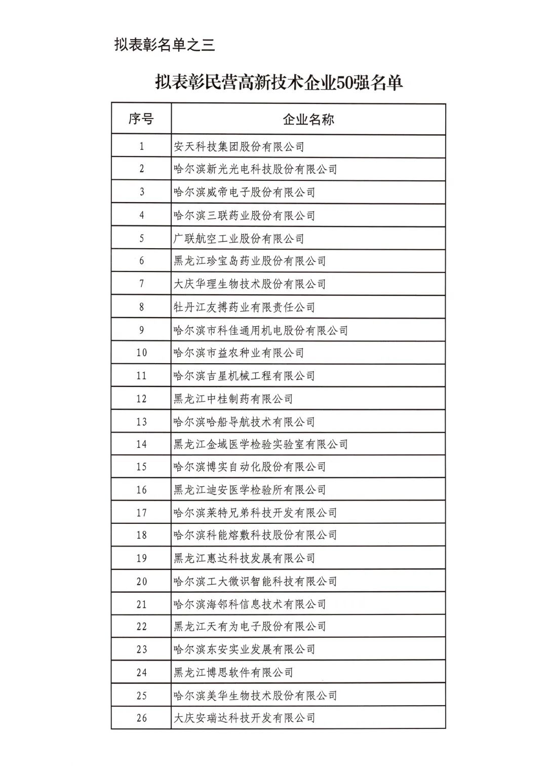 按照省委省政府關于召開全省民營經濟大會的決策部署要求,擬對全省優秀民營企業進行表彰。經企業自愿申報、市(地)把關推薦,評審小組排名,征求相關部門意見等程序,擬表彰全省累計納稅民營企業50戶、就業突出貢獻民營企業20戶、民營高新技術企業50戶、外向型經濟貢獻民營企業30戶、龍江質量品牌優秀民營企業50戶、生物經濟民營企業20戶和數字經濟民營企業20戶。現將擬表彰名單予以公示。